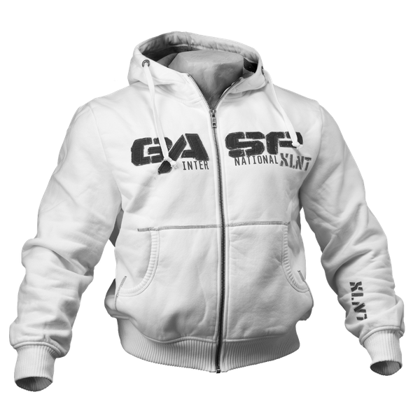 このフーディーは名前の通り、圧倒的な重厚感が特徴です。80% コットン、20% ポリエステルのフリース素材を使用し、重量は 520g/㎡(約1.2lb/㎡)と非常にボリュームがあります。フード裏地はコントラストカラーのサーマルワッフル生地で、しっかりとした手触りを実現。背面フードや胸元・袖には荒々しいディテールが施され、GASP のシンボルが際立ちます。