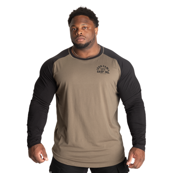 「Iron Camp Raglan LS」は、ラグランスリーブを採用した柔らかく伸縮性に優れたロングスリーブTシャツです。胸元と背中にあしらわれた「Iron Camp」のプリントは、ボディビルの黄金時代を彷彿とさせる、力強くもクラシックな世界観を演出します。