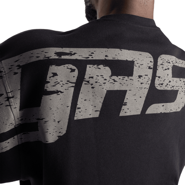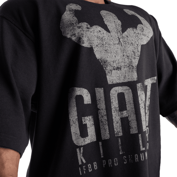 胸元に大胆に配された GiantKiller の大型プリントと、肩から肩へと走るデストレスト加工のバックプリントが、強烈な存在感を放ちます。「GASPIronWorld」の一員であることを示すメッセージとして、妥協を許さない姿勢をストレートに表現しています。