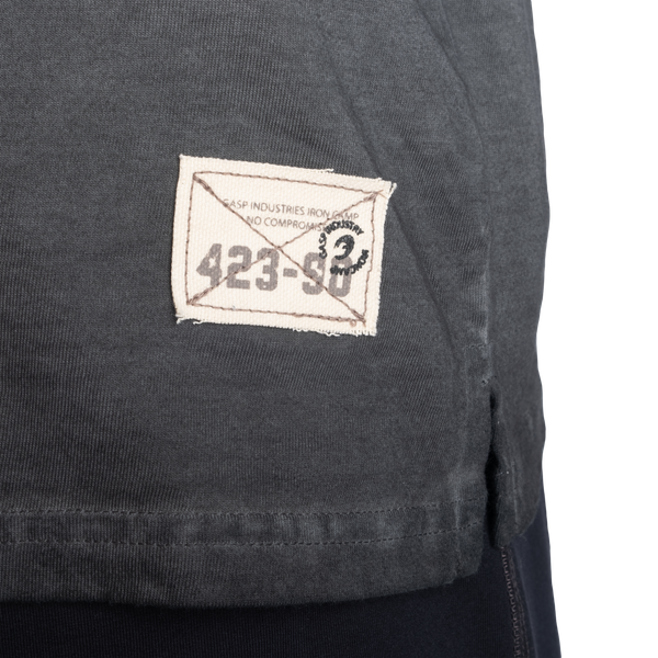 胸・肩部分は身体にフィットし、ウエストはゆったりとしたシルエット。柔らかく洗い込まれたコットン生地。左側には小さな GASP パッチが施され、右肩にはトーン・オン・トーンの GASP ロゴが刺繍風にプリントされています。